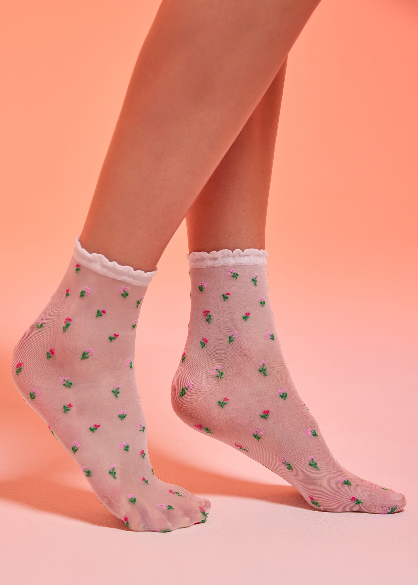 Calzini velati con motivo di fiorellini colorati all over e bordo con picot